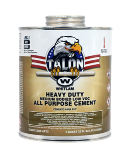 | TALON™ All Purpose Medium Bodied Heavy Duty Low VOC PVC Cement | AP4 | 1/4 Pint (118 ml) | Dauber Top Can | 24 | 10 lbs. (4.5 kg) | 688544040173 |