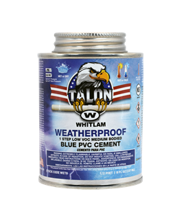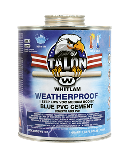 TALON™ WEATHERPROOF All Weather Low VOC Blue Medium Bodied PVC Cement is a fast setting cement that is formulated for wet or dry conditions and/or conditions where quick pressurization is desired. TALON™ WEATHERPROOF is an all-weather cement, suitable for temperature well below -20ºF (-29ºC) to well over 120°F (49ºC).