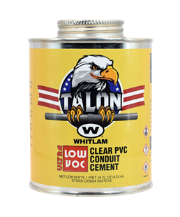 TALON™ Clear Ultra Low VOC PVC Conduit Cement is excellent for PVC Conduit Types I and II up to 6" (15.24 cm) in diameter for both Schedule 40 and Schedule 80. It is a clear medium-bodied cement engineered for speed and performance. Its rapid dry and fast strength development creates a waterproof bond in seconds on electrical conduit. Excellent as a One-Step Cement and suitable for both PVC bell spigots and traditional PVC couplings. No Primer required. Ultra Low VOC makes TALON™ Conduit Cement environmentally safe.