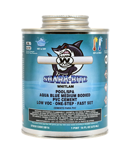 SHARK-BITE Pool/Spa, Medium Bodied One Step Low VOC PVC Cement is a PVC cement for use through 6" (15.24 cm) diameter on all classes of PVC pressure pipe (except Sch. 80) and 8" (20.32 cm) diameter on non-pressure PVC pipe. Excellent for flexible PVC, pool and spa repair/installation, and conditions that are wet. Works well in fabrication of spas due to it fast setting properties.